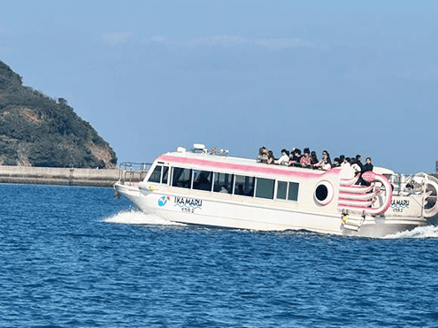船体はイカをモチーフにしたユニークなデザインで、海上から七ツ釜の洞窟や断崖を間近に観賞できるのが特徴。